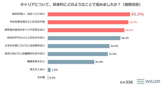 また、【自分のキャリアについて悩んだ経験がある】と回答した人に対し、【具体的にどのような内容で悩んだか(複数回答)】について聞いたところ、「給料が低い、見合ってない」が43.2%で最も高い結果となりました。次いで「今の仕事を続けていけるか不安」が42.3%、「数年後の自分のキャリアが見えない」が40.2%という結果になりました。]