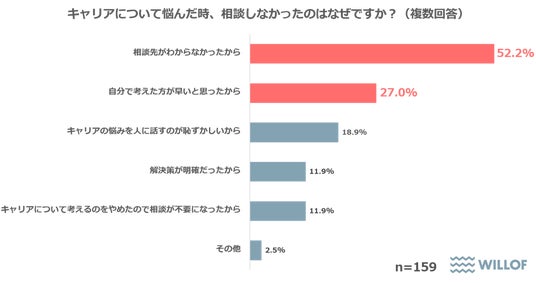 一方で、【キャリアについて相談したことがない】と回答した人を対象に【相談しなかった理由は何か(複数回答)】について聞いたところ、「相談先がわからなかった」という回答が52.2%で最も多い結果となりました。次いで、「自分で考えた方が早いと思った」が27.0%の結果となり、人には相談せず、自分で解決しようとする人が多いことがわかりました。