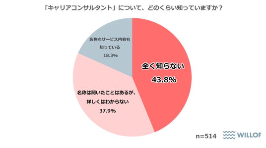 最後に、【キャリアコンサルタントについてどれくらい知っているか】を聞いたところ、「全く知らない」が43.8%と、半数近くの人が知らないという結果になりました。「名称は聞いたことはあるが、詳しくはわからない」という回答も37.9%という結果となり、あわせて80%以上の人がキャリアコンサルタントについてあまり知らない、ということがわかりました。