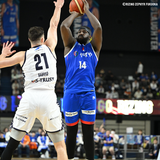 後半に入り、福岡はゾーンディフェンスで対抗し、谷口が3Pシュートを成功させ、チームに勢いを与えていく。しかし、静岡のハードなディフェンスに苦しみ、ターンオーバーを誘発されて得点を許し、リードを広げられる。福岡はタイムアウトやメンバーチェンジで流れを断ち切り、パブロのダンクシュートで勢いをつけ、谷口やギャビンの得点で加点していくが、要所で静岡に得点を許し、接戦を落とした。