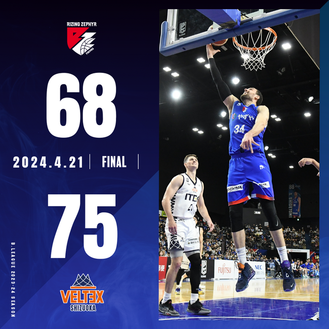 2024年4月21日(日)に開催されました【ライジングゼファーフクオカvs.ベルテックス静岡】において“福岡68-75静岡”の結果となりましたことお知らせいたします。