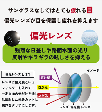 レンズに偏光膜というフィルターを入れて、一定方向の光だけを通す偏光レンズ。