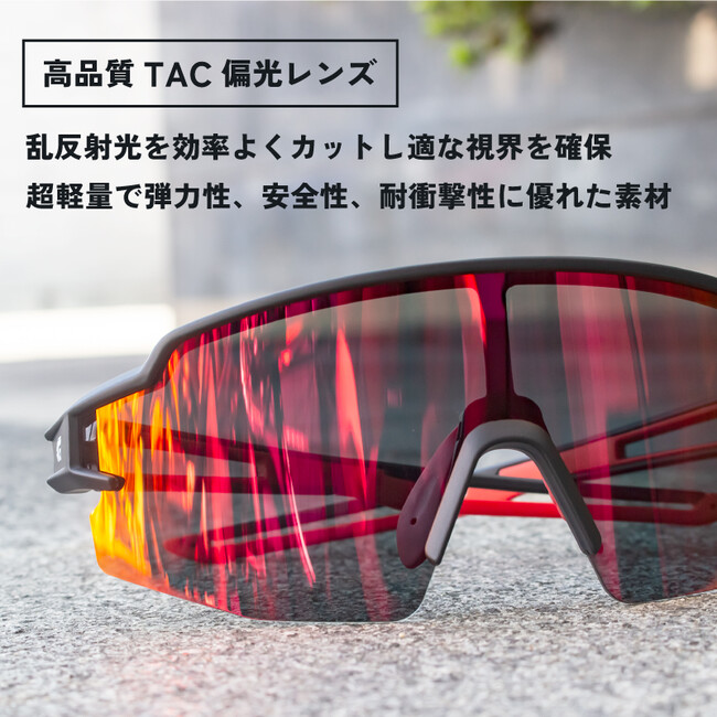 光り反射や眩しさを抑えるのが特徴の偏光レンズを採用したスポーツサングラスです。
