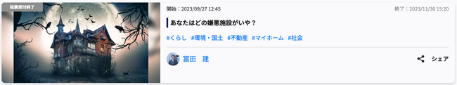 SNSとテクノロジーで社会課題の発見・解決をサポートするPolimill株式会社(ポリミル、本社:東京都港区、代表取締役:横田えり、以下Polimill社)はこのたび、「あなたはどの嫌悪施設がいや?」というイシュー(課題)について11月30日に投票が終了しましたので結果をお知らせします。