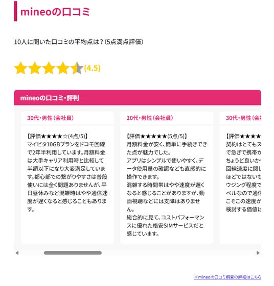 - 口コミの平均点がもっとも高い格安SIMはmineo
