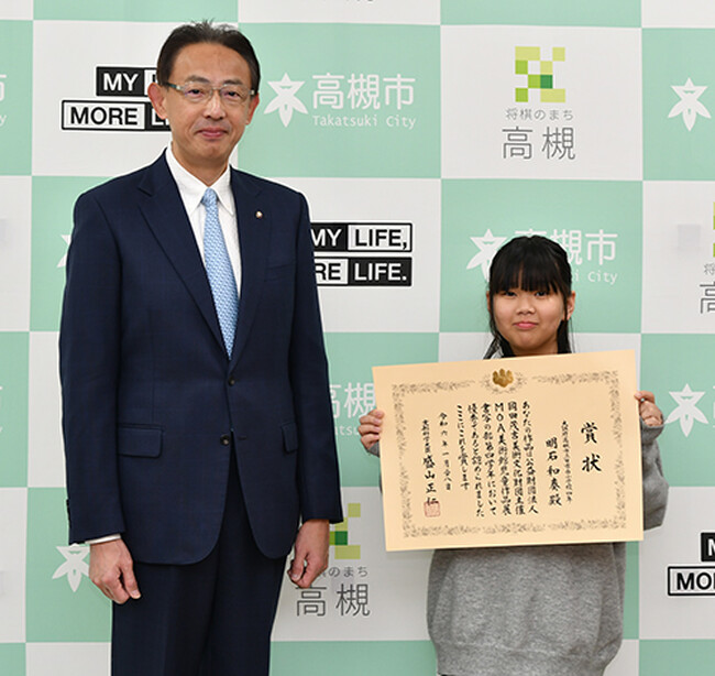 この日、受賞報告に高槻市役所を訪問した明石さんは、「うまく書けて嬉しかったです。これからも頑張ります」と話し、濱田市長は「素晴らしい賞を受賞されたことに敬意を表します。これからも努力の心を忘れず精進してください」と称賛しました。