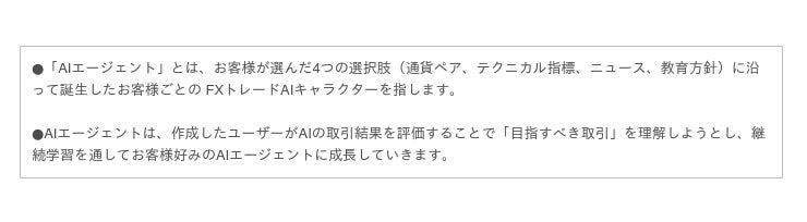 お客様が4つの選択肢を選ぶだけで FXのトレード「AI」を作成することができる無料のシグナル配信サービスです。作成後、お客様がエージェントの売買を評価し、育てていくことで自分好みのトレードを学習させることができる、これまでにはないコンセプトです。