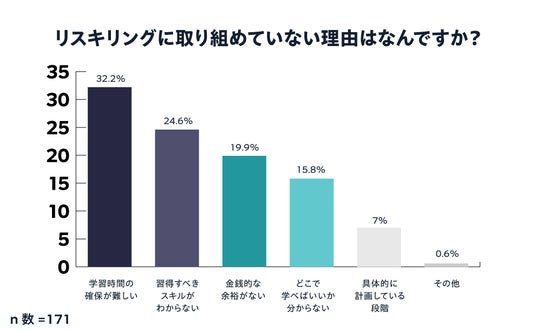 また、「リスキリングに取り組めていない理由」として最も多かったのが、「学習時間の確保が難しい(32.2%)」、そのほか「習得すべきスキルがわからない(24.6%)」、「金銭的な余裕がない(19.9%)」、「どこで学べばいいか分からない(15.8%)」といった理由が続きました。