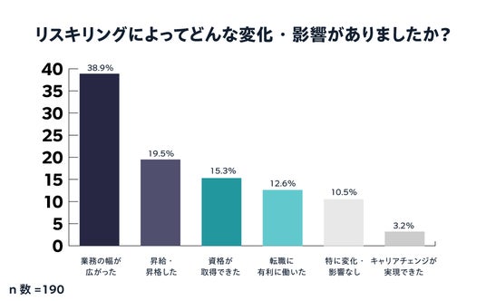 リスキリングに取り組んで得られた具体的な変化・影響の質問には、38.9%の人が「業務の幅が広がった」と回答しており、キャリアの幅が広がるなどの影響を実感。19.5%の人が「昇給・昇格した」と、収入アップにつながったとみられる回答もありました。