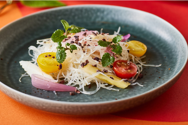ベトナム料理が専門の内藤千博シェフが考案したのは、赤玉ねぎの甘酢和えとイカ、パイナップルに、レモングラスドレッシングが香る春雨サラダ。カカオニブの香ばしさがアクセントになっています。