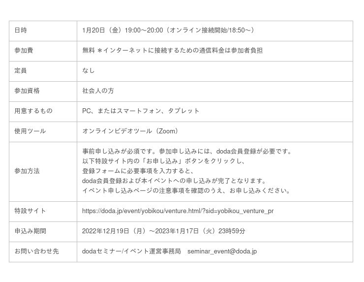 ■特設サイト:https://doda.jp/event/yobikou/venture.html/?sid=yobikou_venture_pr