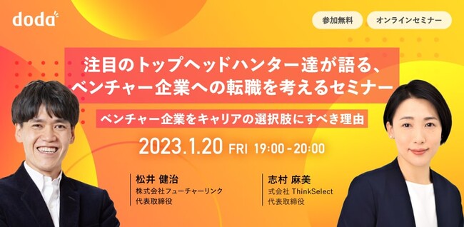 パーソルキャリア株式会社が運営する転職サービス「doda(デューダ)」(編集長:大浦 征也)は、2023年1月20日(金)に、ベンチャー企業に興味があるビジネスパーソンを対象とした、転職・キャリアを考えるオンラインセミナーを開催します。
