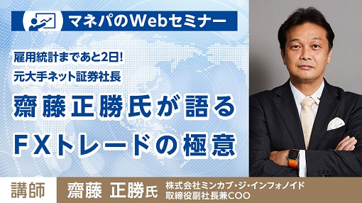 株式会社 マネーパートナーズ(代表取締役社長:福島秀治、本社:東京都港区、以下「マネーパートナーズ」)は、2022年10月5日(水)19時00分より、「雇用統計まであと2日!元大手ネット証券社長 齋藤正勝氏が語るFXトレードの極意」と題しセミナーを開催いたします。講師には、株式会社ミンカブ・ジ・インフォノイド取締役副社長兼COO 齋藤 正勝氏をお迎えします。