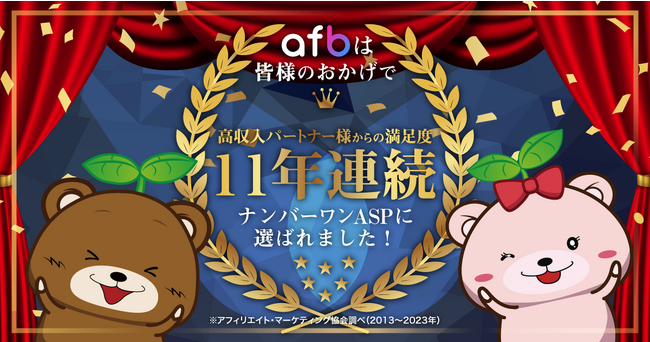 パフォーマンステクノロジーネットワーク「afb(アフィビー)」https://www.afi-b.com/の開発運用をおこなう株式会社フォーイットは、2023年6月 に開催された特定非営利活動法人アフィリエイトマーケティング協会が主催する「第22回アフィリエイト・カンファレンス」の「アフィリエイト・プログラムに関する意識調査2023」における利用者満足度において、高収入パートナーからの満足度No.1 ASPに11年連続で選出されました。