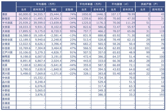 東京23区の各行政区毎に、平均価格、平均坪単価、平均面積、供給戸数をまとめました。当月の平均価格が大きい順に表示しています。