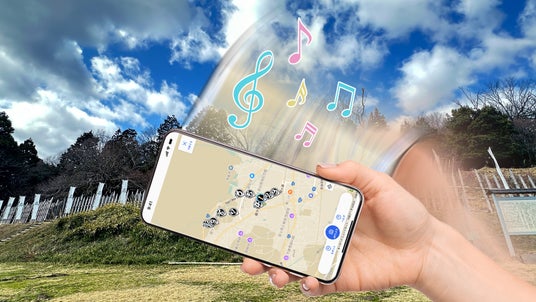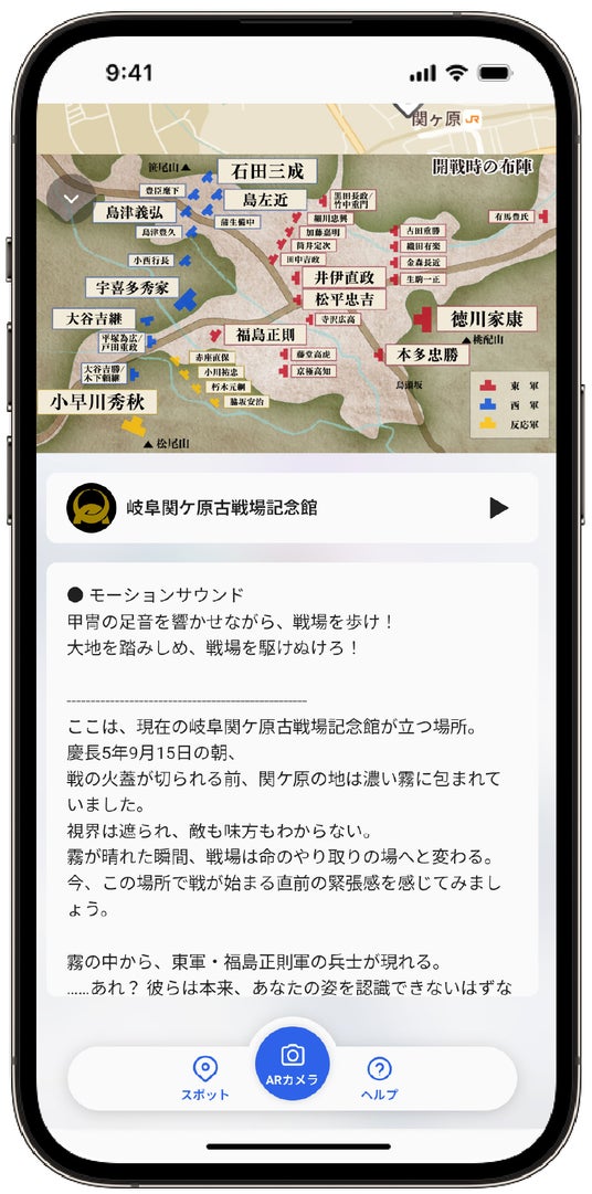 「決戦!関ケ原」は、関ケ原町の古戦場エリアを舞台にした、音声ARコンテンツです。史跡を巡ると、位置情報に連動して「武将たちの話し声や、刀がぶつかり合う音、鉄砲の轟き、馬のいななき等、臨場感あふれるサウンド」が自動的に再生されます。ソニーのモーションサウンド技術により、参加者の動きに合わせて甲冑の音が鳴り、スマートフォンを振ることで刀を振る体験も可能です。さらに、特定のスポットでは武将ARが出現し、ARカメラで武将との記念撮影ができます。撮影した画像をSNS等に投稿してもらうことで、観光地のPRにも繋がります。これらの機能により、従来の街歩きを超えた没入感あふれるインタラクティブな体験を、実際の古戦場で楽しむことができます。また、本コンテンツは、英語にも対応しておりインバウンド需要の取り込みも図ります。