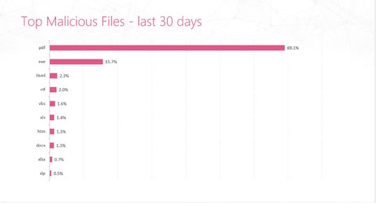 - 最大の脅威となったPDF:PDFは悪意ある添付ファイルにおける主要な脅威ベクトルとなっており、直近1カ月の集計では、全世界で確認された不正ファイルの約4分の3がPDFでした。電子メールにおけるPDFを悪用した攻撃の割合は、2022年の16%、2023年の20%から大幅に増加しており、その勢いは留まりません。特に医療業界では、悪意あるファイル全体の83%をPDFが占め、悪意あるPDFによる攻撃を最も多く受けた業界となりました。