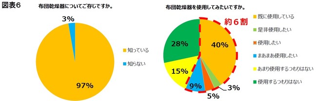 布団乾燥機はほぼ全員が知っており、約6割の人が「既に使用している」、「今後使用したい」と