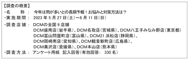 今年は例年より梅雨入りが早かった地域が多く、加えてエルニーニョ現象の発生により、この夏は多雨の傾向が強いと予想 されています。そのような中、湿気に関するお悩みが増加してくると予想されます。そこで、ホームセンターのDCM株式会社(本社:東京都品川区、代表取締役社長:石黒靖規、以下、DCMは、「雨が多い時のお悩みと対策方法」をテーマにアンケート調査を行いました。ここに、調査結果をお知らせします 。