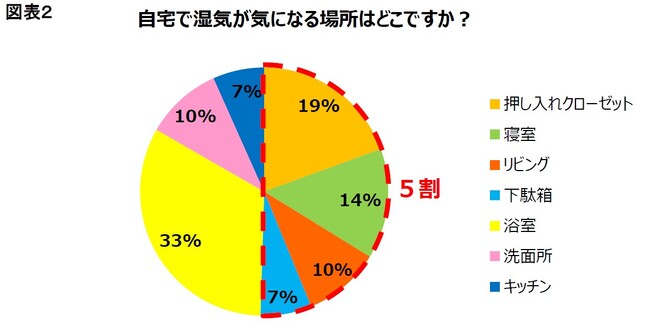 屋内での湿気の影響を受ける場所として、半数の人が水回り以外の場所に注目湿気の影響を受けやすく、気に