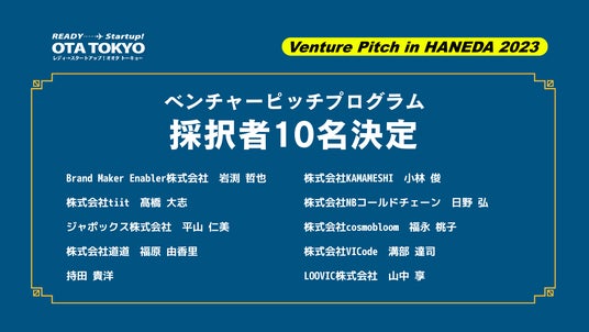 エイチタス株式会社(本社:東京都品川区、代表取締役:原 亮/小澤 剛)が運営を行う、Ready→Startup!OTA TOKYO(主催:公益財団法人大田区産業振興協会)では、「ベンチャーピッチプログラム」採択者10名が決定いたしました。
