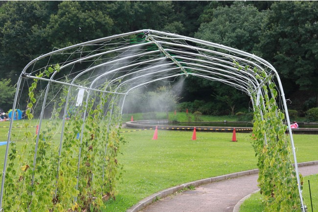 つる植物でできたグリーンカーテンと、ミストで涼をお届け!