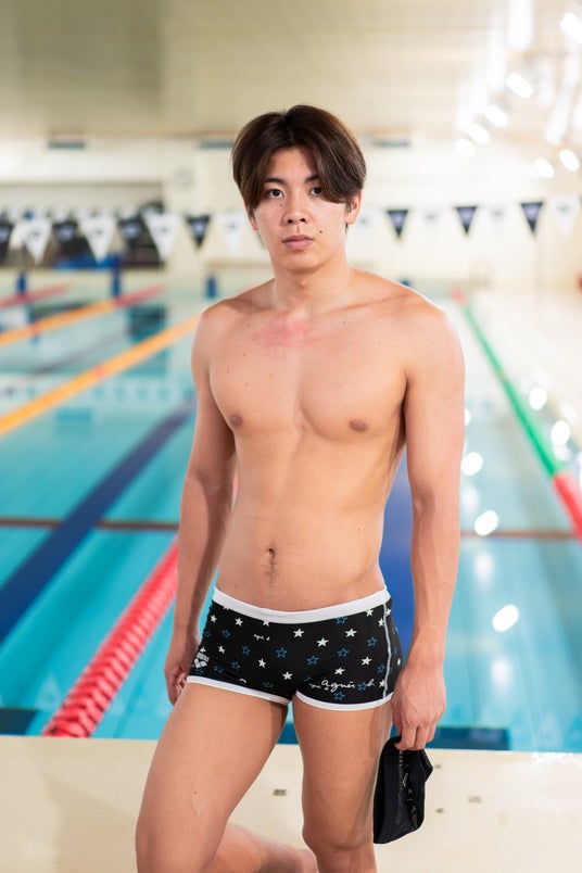 モデルは、柳本 幸之介 選手(イトマン東京 / 日本大学)品 名:agnes b. x arena トレーニングスパッツ(ショートレッグ)