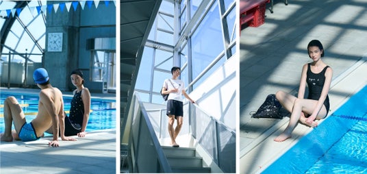 2024年の新作コレクションは、水の中で煌めくような青のグラデーションや小さな星を、メインデザインとしたラインアップです。メインデザインを採用した、塩素に強く長持ちするトレーニング水着をはじめ、シンプルなロゴデザインで着やすいパッド付きフィットネス水着、UVカット機能のあるTシャツやパンツ、さらにスイムキャップやバッグなどの小物に至るまで全25型を展開します。トップスイマーにも認められている『アリーナ』の機能性、動きやすさに加え、両ブランドのロゴをいれたシンプルなデザインを『アニエスベー』のアイコンカラーである黒と白のモノトーンをベースに、アクセントにブルーを効かせたカラーで表現。コラボレーションならではの両ブランドの強みを生かした商品です。