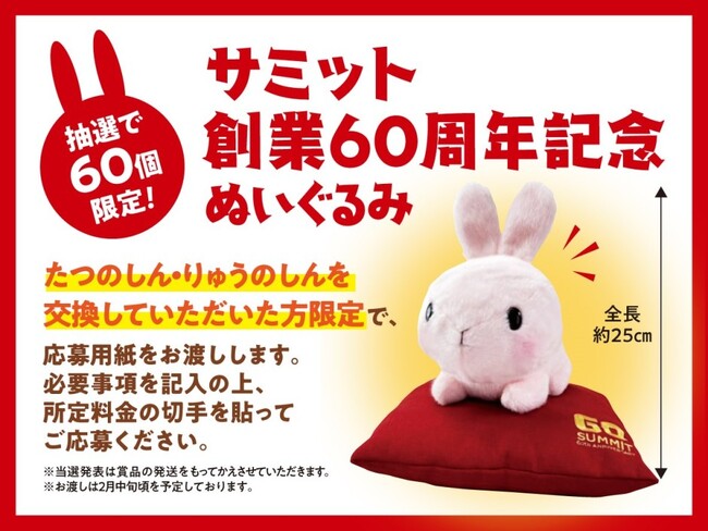 今回、『サミット創業60周年記念ぬいぐるみ』もご用意しております。たつのしん・りゅうのしんを交換していただいた方限定で応募用紙をお渡しします。抽選の結果、60名様に賞品を発送させていただきます。