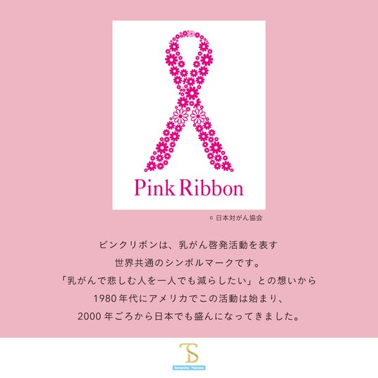 女性が好きなハートやリボンモチーフを使用したバッグなどを多く取り揃えたレディースバッグを展開するブランド『Samantha Thavasa(サマンサタバサ)』のコンセプトは「女性の永遠のパートナー」。会社で働く1500人のサマンサ女子やお客様を永遠に大切にていきたいという想いも込めて、今回のキャンペーンは、乳がんの正しい知識を広め、定期検診による早期発見を促し、意識を高めることなどを目的として活動している「日本対がん協会 ピンクリボン」に賛同し、寄付を行う。