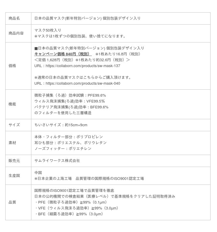 サムライワークス株式会社(代表取締役社長:新島 実 本社所在地:東京都渋谷区)の"日本の品質マスク<新年特別バージョン>個別包装デザイン(ちいさいサイズ)"を、1箱840円(税別)で売り切りセールを開催いたします!