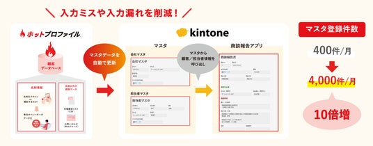 ホットプロファイル導入後は、ホットプロファイルに取り込んだ名刺データがそのままkintoneのマスタデータに流れることで、営業担当が手入力で打ち込む必要がなくなり、マスタの登録にかかる作業時間を年間で約8,000時間削減することに成功。