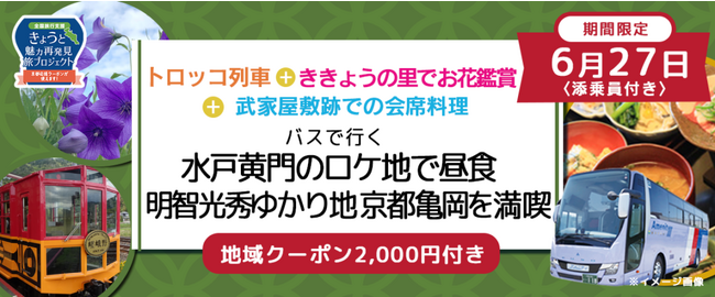 株式会社フォーティーズ(本社:大阪市鶴見区、代表取締役 岡武史)は《きょうと魅力再発見旅プロジェクト》6月27日(火) トロッコ列車+ ききょうの里でお花鑑賞 武家屋敷跡での会席料理 バスで行く水戸黄門のロケ地で昼食 『明智光秀ゆかり地 京都亀岡を満喫』日帰りバスツアーのオンライン販売を開始しました。