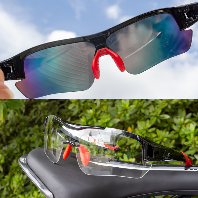 光り反射や眩しさを抑えるのが特徴の偏光レンズを採用したスポーツサングラスです。交換レンズとインナーフレームが付属しており、天気や時間など状況に応じて、3種類のレンズに簡単に変更できます。