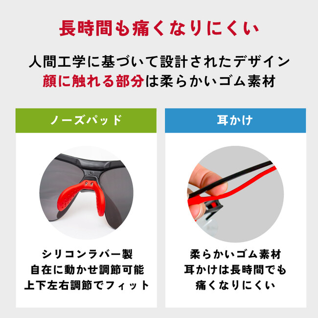 耳かけ部分に柔らかいゴム素材を採用し耳が痛くなる事が軽減します。