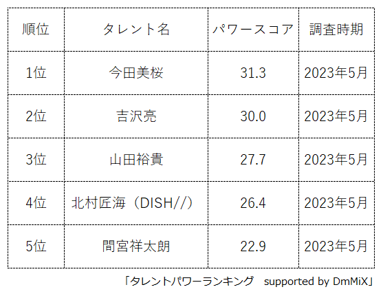 本ランキングは、2023年5月度に実施したタレント調査データ(一部過去実施データ)を利用し、タイトルに応じてランキング形式でまとめたものです。