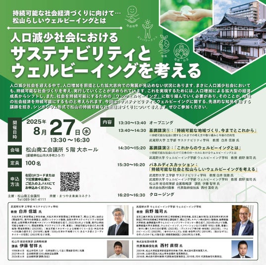 当日は武蔵野大学教員の白井 信雄教授、前野 隆司教授、松山市役所職員の伊藤 智祥氏、株式会社西村商事の西村 直樹氏が登壇し、講演およびディスカッションを行います。人口減少社会における地域づくりの課題、持続可能な社会のあり方、そしてウェルビーイングの実践的導入について、多角的な視点から意見を交わします。