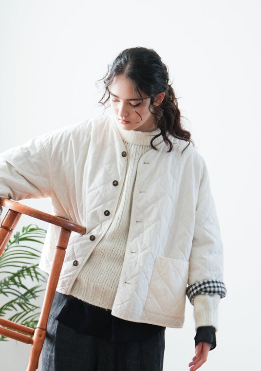 高密度で程良いハリのあるコットンラミーの中綿キルティングと、裏側にチェック柄を用いたリバーシブルアウターです。
