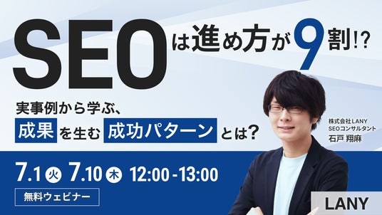 デジタルマーケティング支援を提供する株式会社LANY(東京都渋谷区、代表取締役社長:竹内渓太)は、【無料ウェビナー】SEOは“進め方”が9割──実事例から学ぶ、成果を生む成功パターンとは?を7/1(火)・7/10(木)に開催いたします。