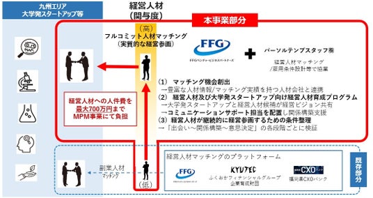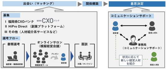 従来から取り組んでいる「福岡県CXOバンク」、パーソルキャリアの副業プラットフォーム「HiPro Direct」、その他人材紹介サービスなどに登録している経営人材候補の中から、パーソルテンプスタッフが持つマッチングのノウハウを活用し、オンラインサロンも活用しながら、より確度の高いマッチングを実現してまいります。