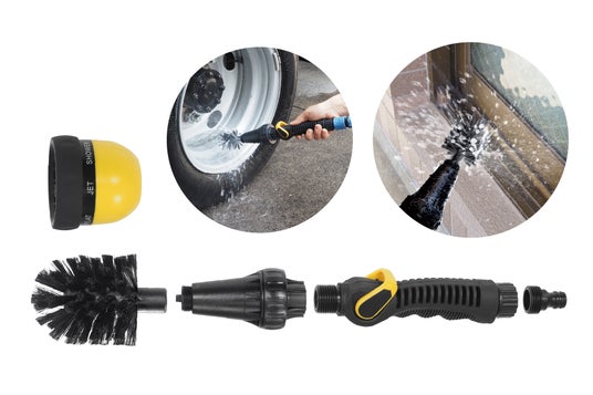 付属の回転ブラシはタイヤのホイールや、窓枠などのしつこい泥汚れの掃除にぴったり。普段使いに嬉しいマルチノズルと使い分けて隅々までキレイに!