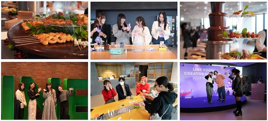 本コンテストに入賞したクリエイターを招き、表彰セレモニーがスタートしました。セレモニーの様子は「LINE VOOM」にてライブ配信し、クリエイターのファンの皆様から応援コメントやたくさんのリアクションを集めました。セレモニーでは入賞したクリエイター全員にトロフィーや賞金を授与し、『MVP賞』と各『部門賞』に選出された受賞クリエイター、今回急遽追加した『特別賞』の受賞クリエイターがそれぞれに受賞の喜びを語りました。また、フリータイムでは、会場のいろいろな場所でクリエイター同士が交流を深めるとともに、フォトゾーンでの撮影やチュロス作り、カスタムモールドールなどが体験できるワークショップを和気あいあいと楽しんでいました。