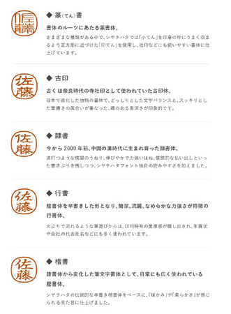 書体:篆(てん)書、古印、隷書、行書、楷書