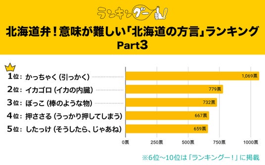 調査方法:株式会社CMサイトがインターネットリサーチした<北海道弁!意味が難しい「北海道の方言」ランキングPart3>のアンケート結果を集計。