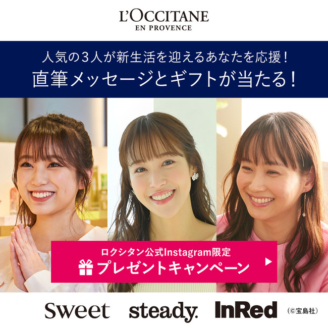 さらに、特設サイトでは、宝島社の人気女性誌sweet、steady.、InRedの3誌とコラボし、この春新生活を迎えるHKT48の矢吹奈子さん、フリーアナウンサーの鷲見玲奈さん、タレントの藤本美貴さんを起用。この春の香りの応援ギフトについて語ります。またこの春新生活を迎える人への限定メッセージ動画や、プレゼントキャンペーンも実施。sweetで HKT48の矢吹奈子さんが、steady.でフリーアナウンサーの鷲見玲奈さんが、InRedでタレントの藤本美貴さんが紹介した、新生活を応援するための香りのギフトと直筆の応援メッセージカードが当たります。ぜひご応募ください。