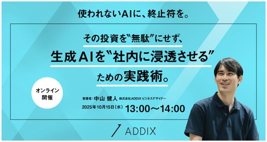 株式会社ADDIX(所在地:東京都港区、代表取締役社長:伊藤雄剛 以下、ADDIX)は、生成AIを活用する企業が直面する課題を解決するオンラインセミナー「使われないAIに、終止符を。(https://service.addix.co.jp/seminer_251015)」と題したセミナーを10月15日(水)にオンラインにて開催します。
