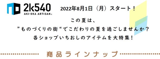 “日本のものづくり”をコンセプトとした、JR秋葉原駅~御徒町駅間の鉄道高架下に位置する商業施設『2k540 AKI-OKA ARTISAN(ニーケーコ゛ーヨンマル アキオカ アルチサ゛ン)』(以降、2k540)より、この夏のおすすめアイテムを紹介いたします。