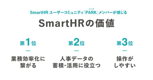 株式会社SmartHR(本社:東京都港区、代表取締役CEO:芹澤 雅人、以下「当社」)が提供するクラウド人事労務ソフト「SmartHR(スマートエイチアール)」が、労務管理クラウド市場の出荷金額において、2018年から6年連続となるシェアNo.1(※)を獲得しました。また、当社が運営する「SmartHR」ユーザーコミュニティ「PARK(パーク)」の参加者を対象に実施したアンケートでは「SmartHR」を利用する上で特に価値を感じているポイントとして「業務効率化に繋がる」「人事データの蓄積・活用に役立つ」「操作がしやすい」などの回答が得られました。