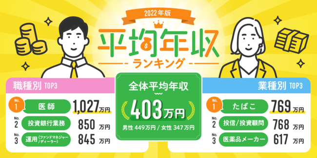 また、全167職種のうち、ランキング1位は「技術系(メディカル/化学/食品)」の「医師」(1,027万円)でした。2位と3位には「金融系専門職」の「投資銀行業務」(850万円)と「運用(ファンドマネジャー/ディーラー)」(845万円)が続きました。