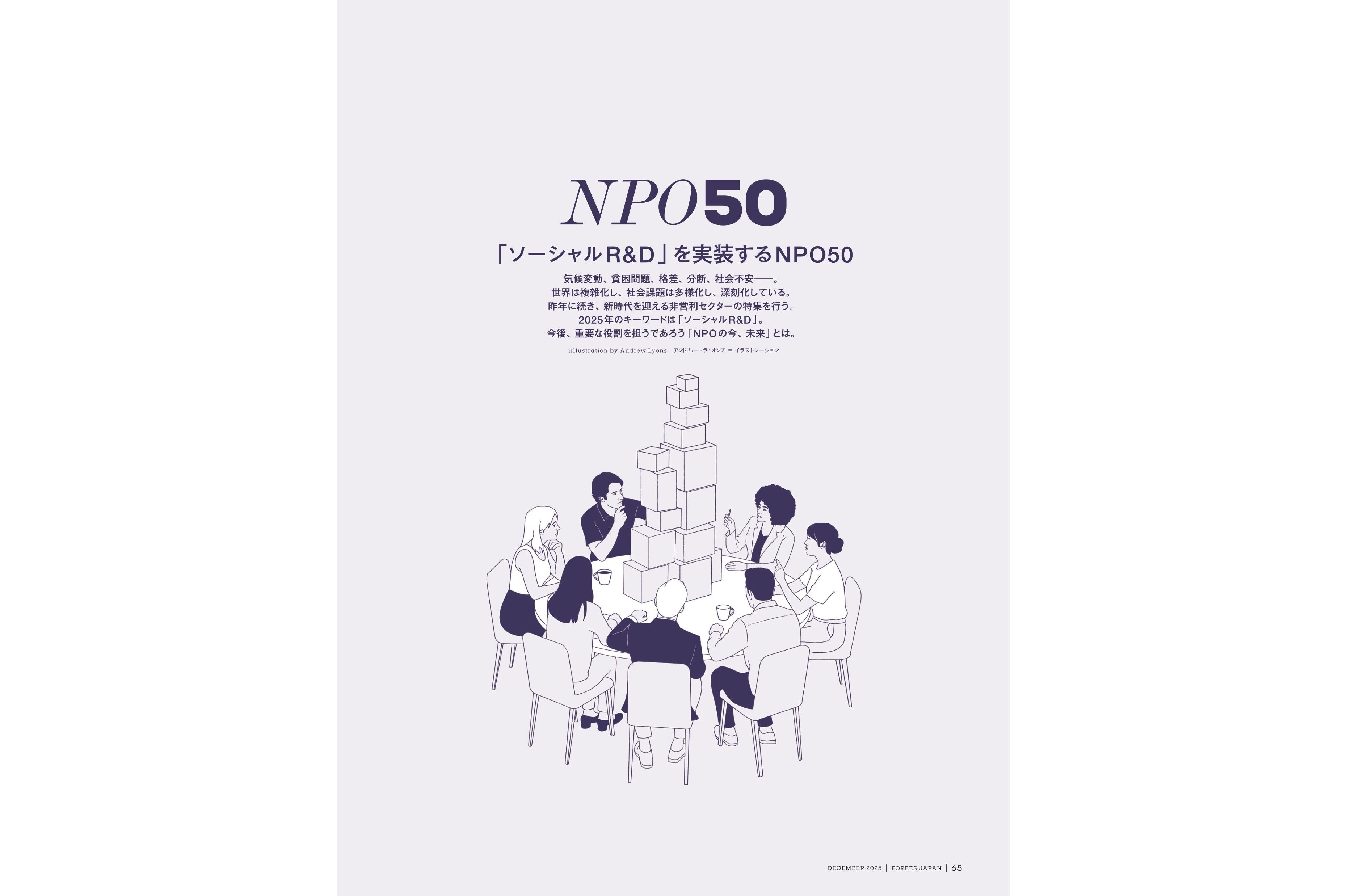 気候変動、貧困問題、格差、分断、社会不安―。世界は複雑化し、社会課題は多様化し、深刻化している。2024年に続き、新時代を迎える非営利セクターの特集を行う。2025年のキーワードは「ソーシャルR&D」という造語だ。同特集では、NPOだからできる「ソーシャルR&D 50」と称して、50団体のリストも掲載。今後、経済社会における重要な役割を担うであろう「NPOの今、未来」とは。